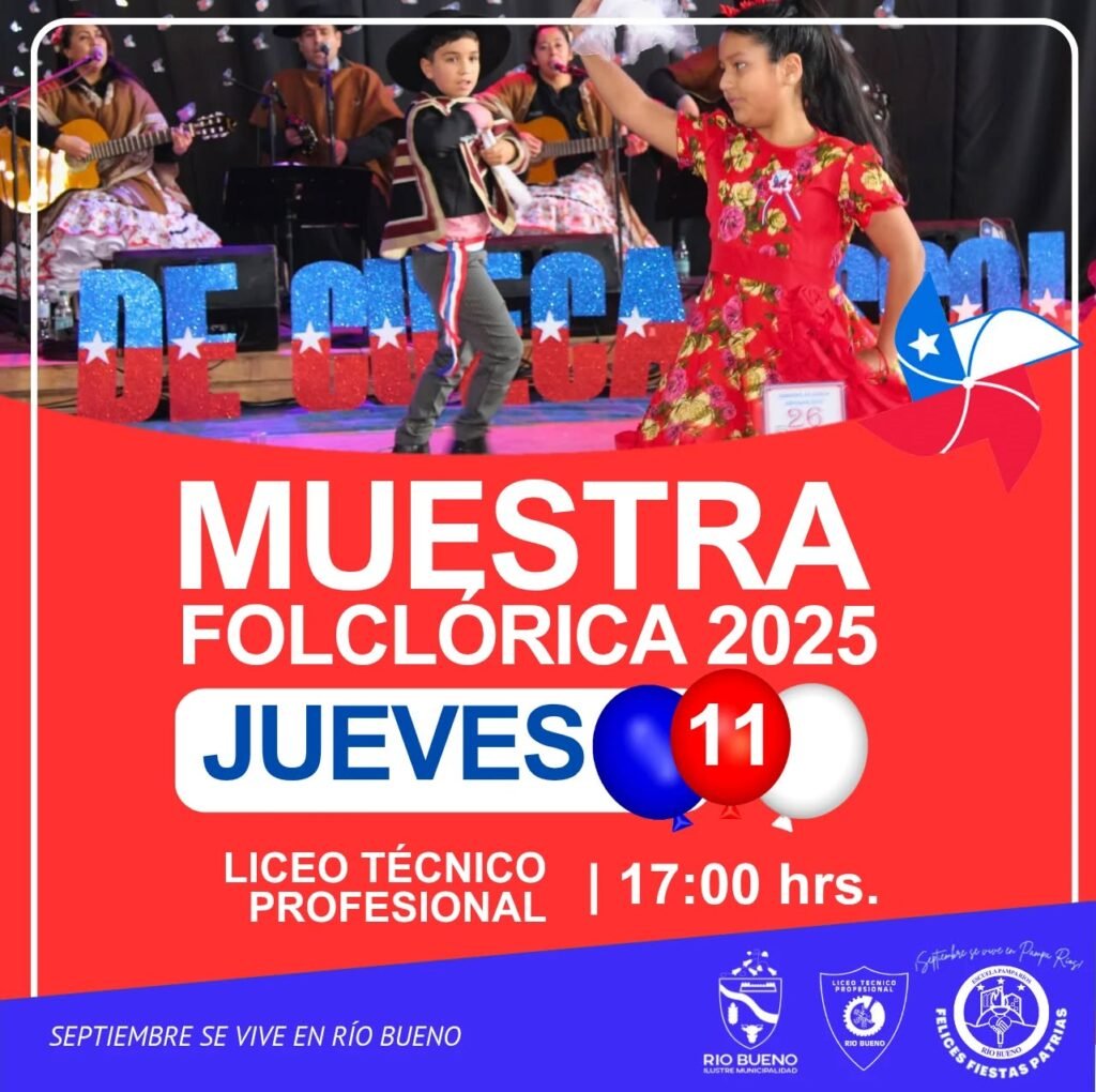 Invitamos cordialmente a toda la comunidad de Río Bueno a disfrutar de la Muestra Folclórica Comunal 2025, que se realizará el jueves 11 de septiembre a las 17:00 horas en el gimnasio del Liceo Técnico Profesional de Río Bueno.